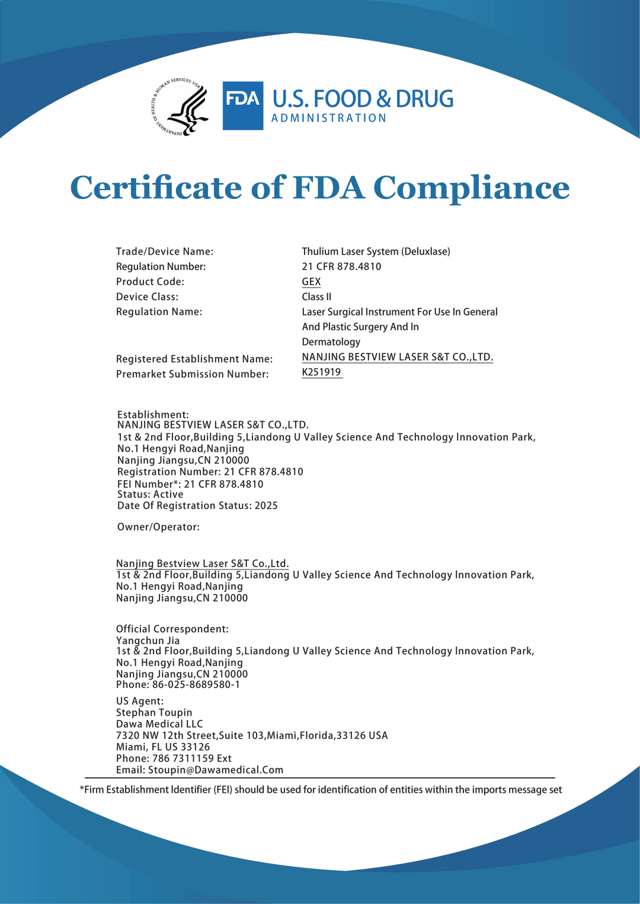 南京佰福激光技术有限公司(NANJINGBESTVIEW LASER S&T CO.,LTD.)自主研发的铥激光治疗仪(Deluxlase),成功通过美国食品药品监督管理局(FDA)的严格审核,荣获国内首张皮肤科铥激光治疗仪的FDA 认证!