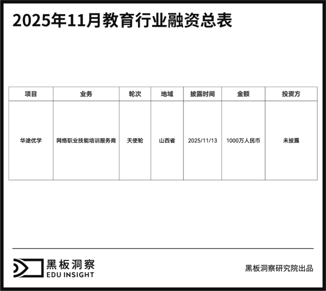 2025年11月,教育行业仅披露1起融资事件,融资总金额为1000万元人民币。融资企业为专注职业技能培训的在线教育平台—— 太原华途优学教育科技发展有限公司 。在整体融资环境趋于理性、资本审慎筛选投资标的的背景下,华途优学教育仍获得千万元天使轮投资,凸显职业教育赛道在国家战略与市场需求双重驱动下的持续韧性与增长潜力。