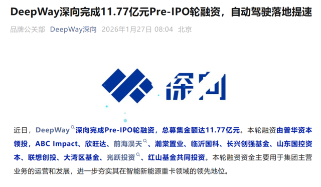 深向科技股份有限公司(下文简称“DeepWay深向”)宣布完成Pre-IPO轮融资,总募集金额达11.77亿元。 本轮融资由普华资本领投,ABC Impact、欣旺达、前海淏天、瀚棠置业、临沂国科、长兴创强基金、山东国控资本、联想创投、大湾区基金、光跃投资、红山基金共同投资。