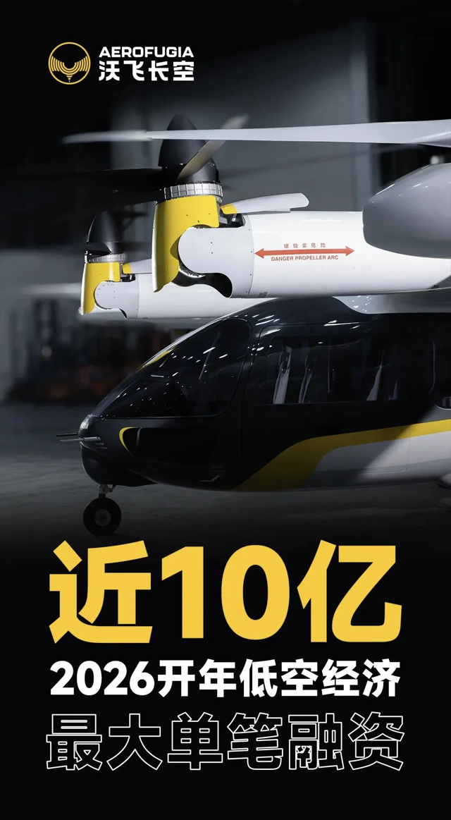 2026年2月2日, 国内领先eVTOL主机厂 「沃飞长空」 宣布完成近10亿新一轮融资, 一举 创下开年低空经济最大单笔融资纪录 ,以硬核实力领跑行业,为中国eVTOL在先进空中交通产业抢占全球竞争先机注入澎湃动能。