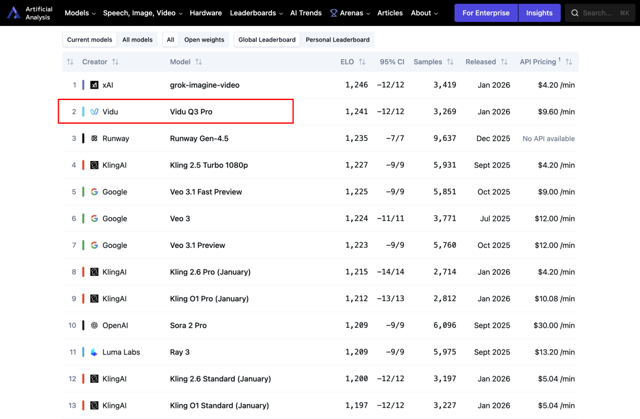 近期发布的Vidu Q3模型,是全球首个“为剧而生”的视频模型,支持16S声画同出、1080P高清画质、丰富的镜头语言、精准切镜、多国文字渲染和多语言输出。在国际权威AI基准测试机构Artificial Analysis 最新公布的榜单中,Vidu Q3 排名中国第一、全球第二,比肩xAI Grok,超越 Runway Gen-4.5 、Google Veo3.1和 OpenAI Sora 2。