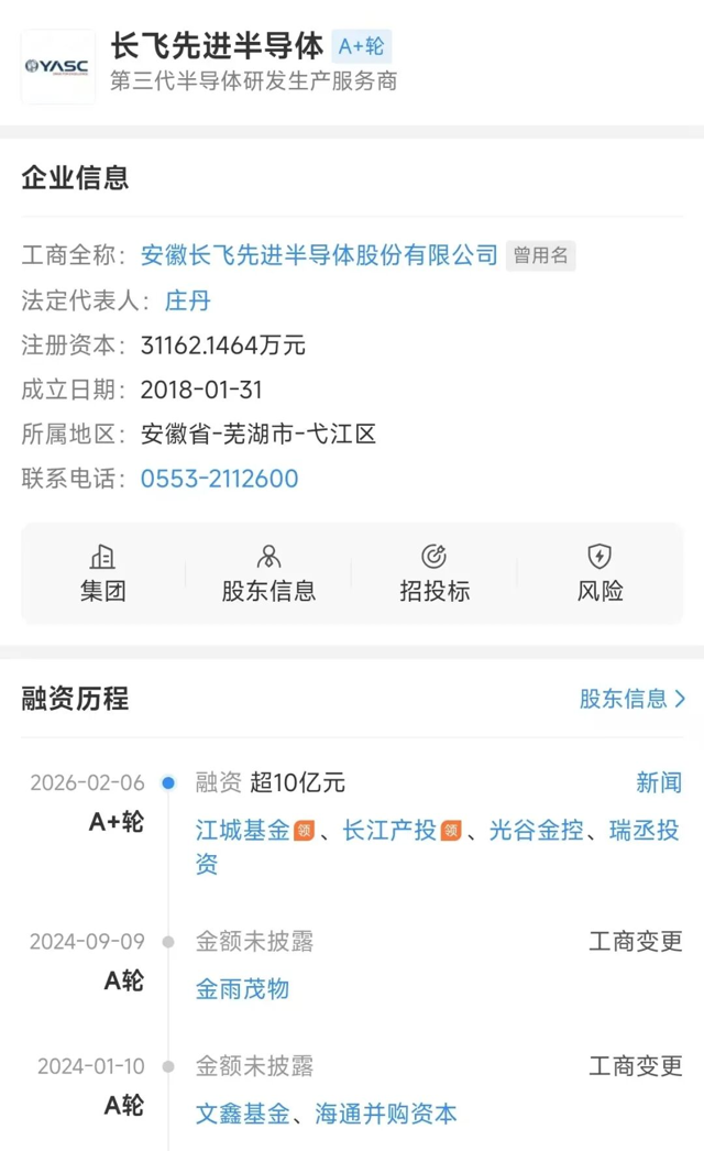 长飞先进半导体宣布完成超10亿元A+轮股权融资 ,由江城基金、长江产业集团领投,光谷金控、奇瑞旗下芯车智联基金等机构参投。两年多以前,长飞先进曾以38亿元A轮融资刷新行业记录。